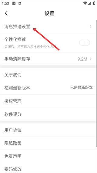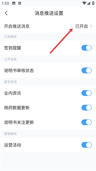 3、在消息推送设置页,点击【开启推送消息】进入详情页面。