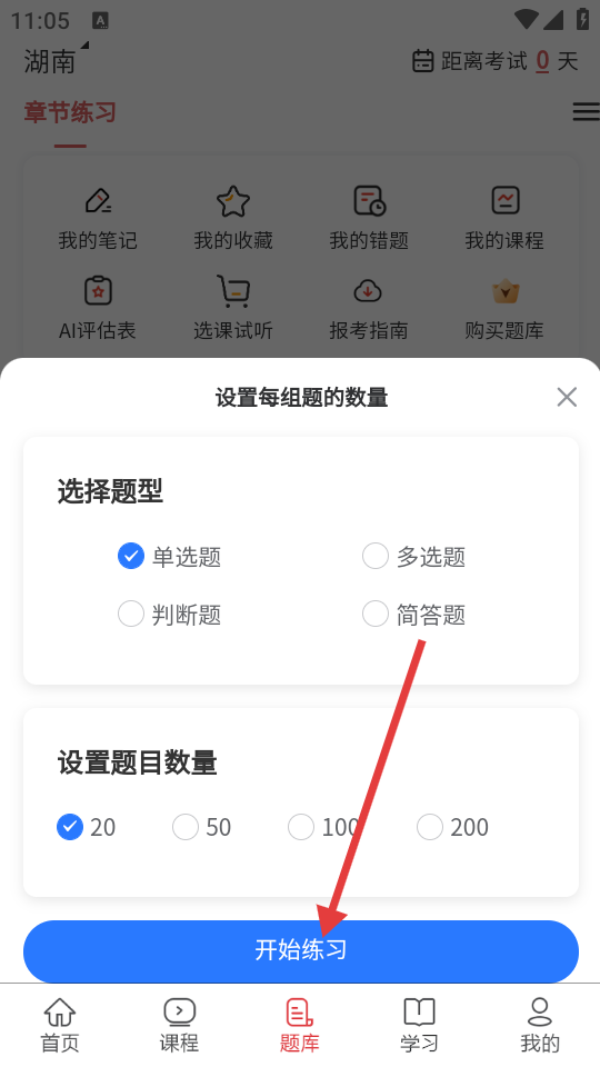 2、在弹出的“设置每组题的数量”窗口中,选择题型和题目数量,点击【开始练习】。