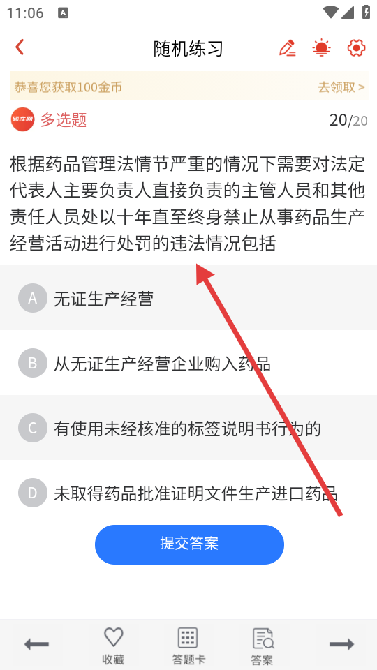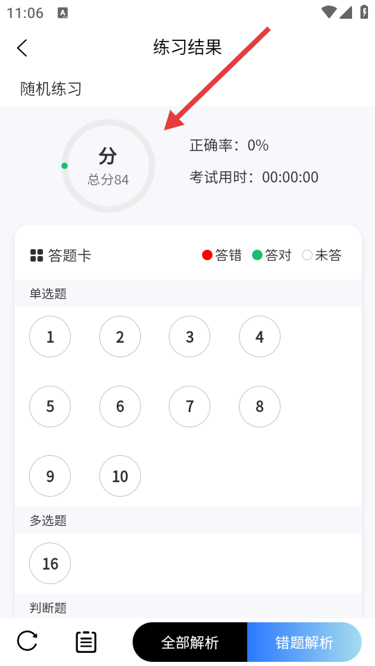 4、作答完成后,提交答案,进入练习结果页面,查看得分、正确率等练习结果,还可进行全部解析或错题解析等操作。