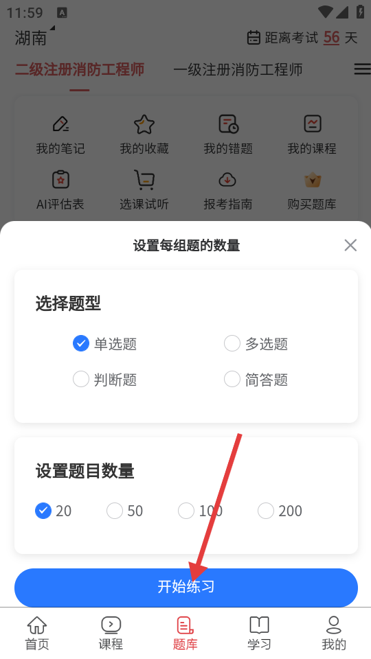 2、在弹出的设置每组题的数量界面,选择题型并设置题目数量,然后点击【开始练习】。