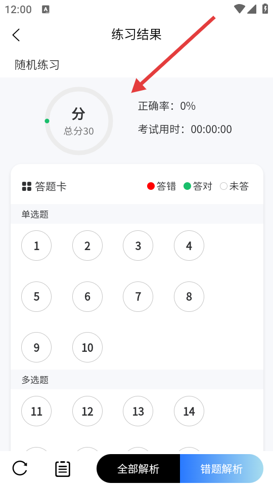 4、答题完成后,进入练习结果页面,可查看正确率、考试用时以及答题卡等信息。