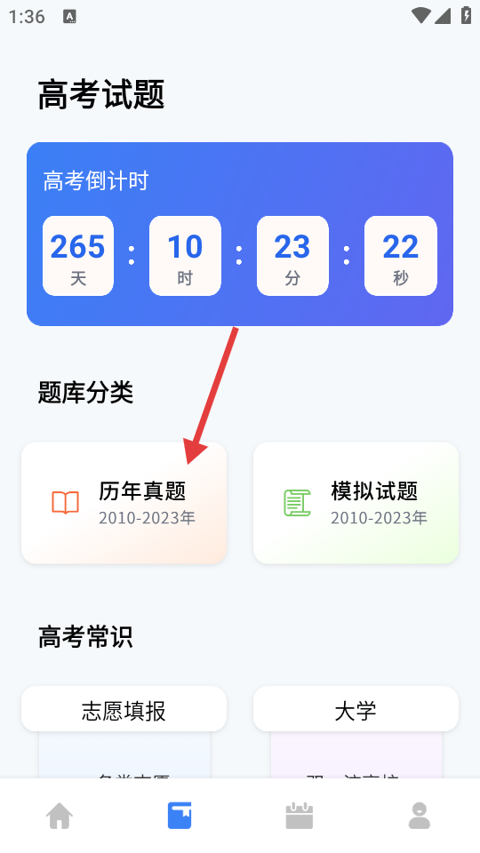 1、打开APP,在首页点击底部试题按钮,进入相关页面。
