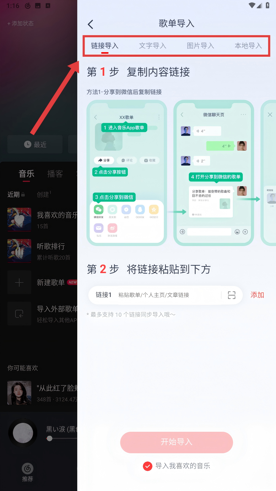 3、进入【歌单导入】界面,有【链接导入】、【文字导入】、【图片导入】、【本地导入】等多种方式,可任选其一呢。