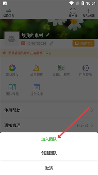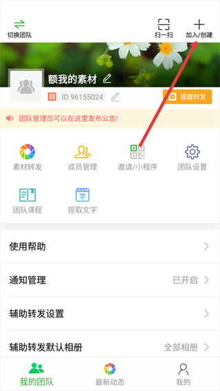1、在展示【我的团队】的界面,点击右上角【加入/创建】按钮。