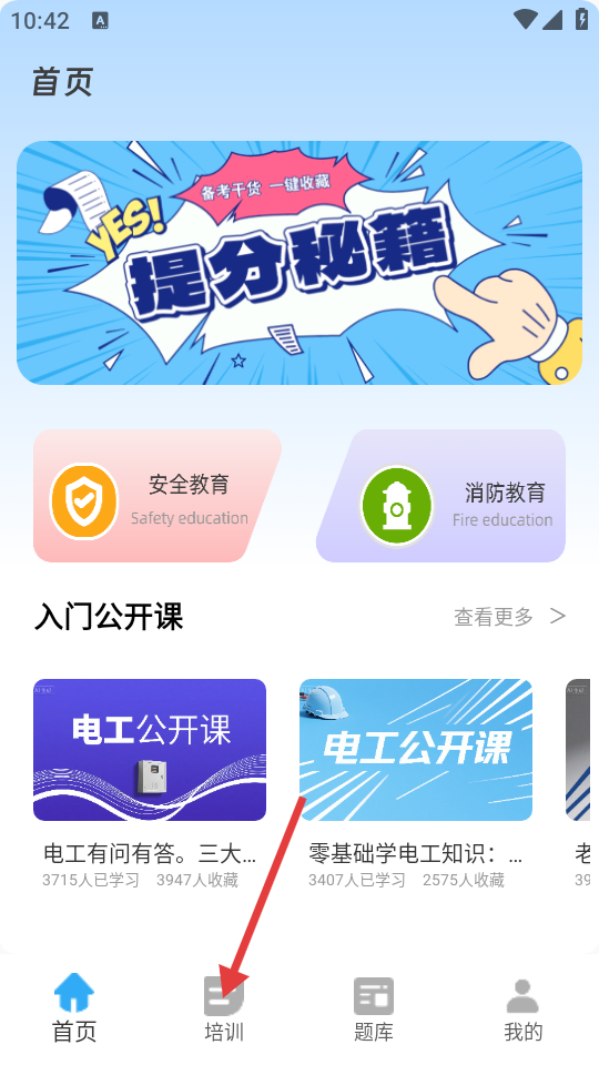 1、在首页中,点击底部【培训】按钮,进入培训页面。