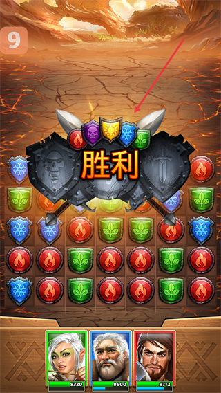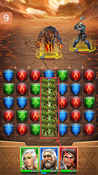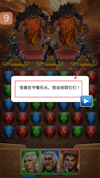 1、拖动【绿色】方块消除,为对应英雄积攒能量,攻击前方的熔岩怪与骷髅兵,推进战斗进度。