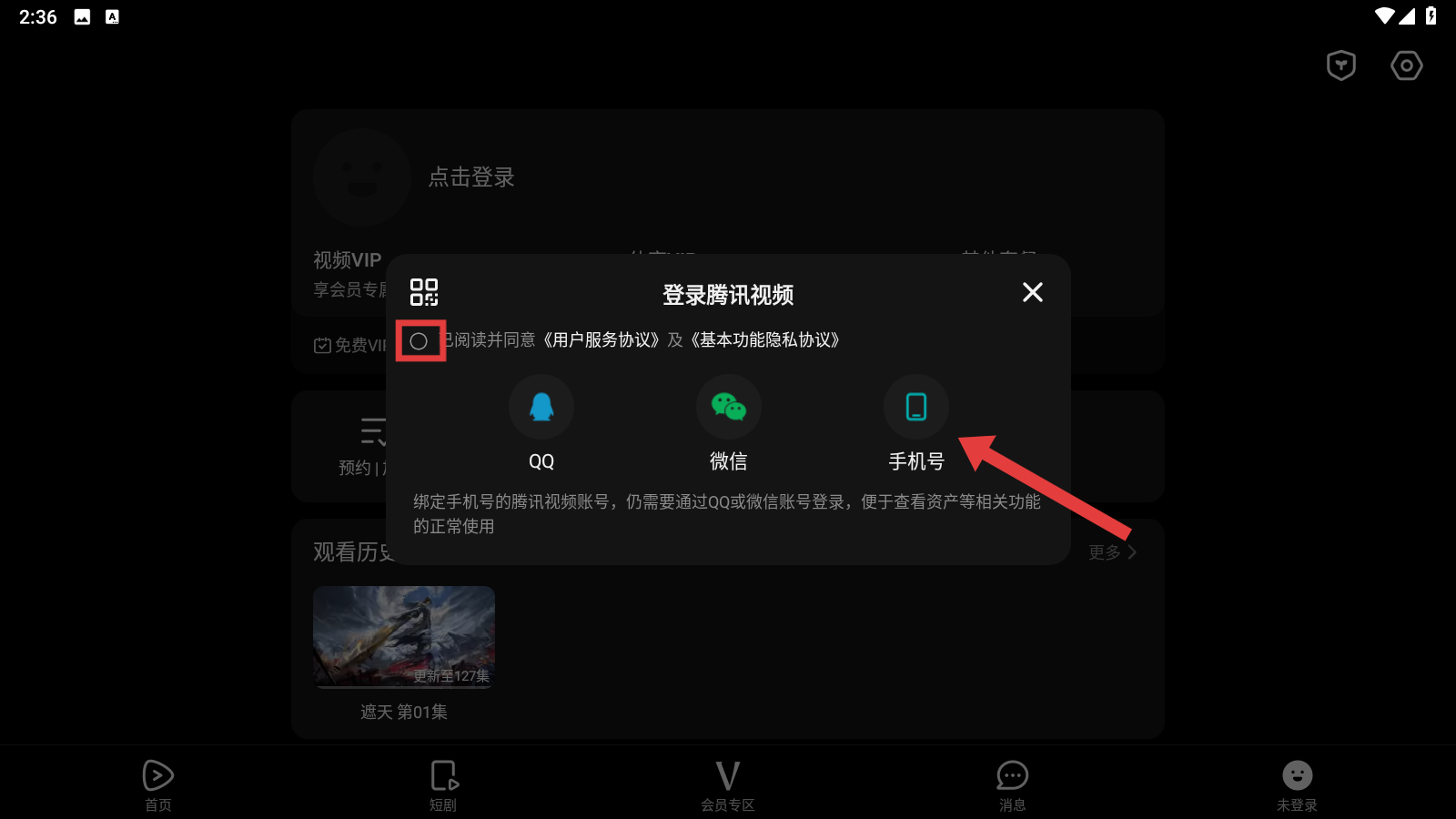 3、接着会弹出登录选项,我们先勾选协议,再点击【手机号】这个登录方式哦。