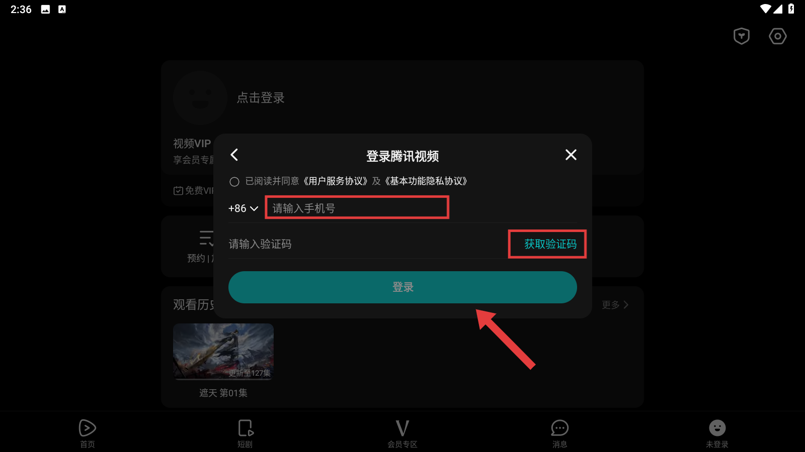 4、然后在输入框中填入手机号,获取并输入验证码,最后点击【登录】按钮,就能完成手机号登录啦。