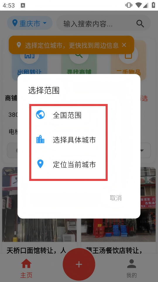 1、使用软件时,根据需求选【全国范围】【选择具体城市】或【定位当前城市】,确定商铺搜索的地域范围。