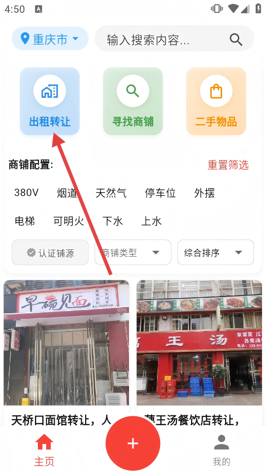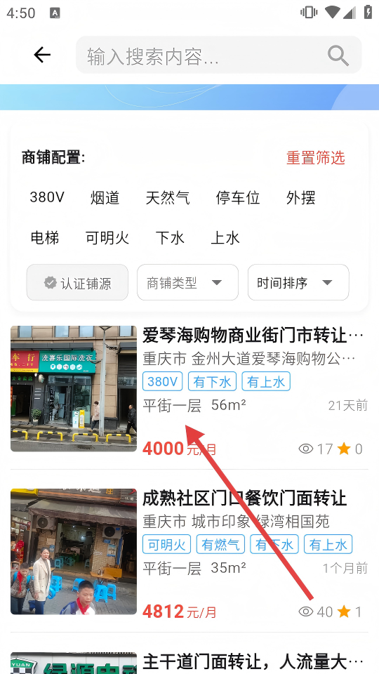 3、在出租转让页面,利用【380V】【烟道】等商铺配置筛选,找到符合需求的商铺,点击进入详情页。