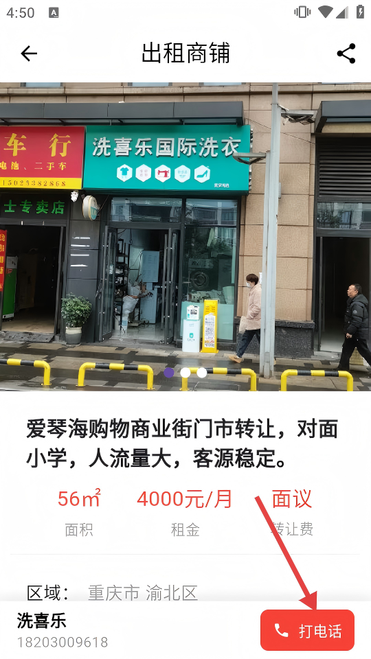4、进入具体出租商铺详情页,查看面积、租金等信息后,若有意向可点击【打电话】,联系房东沟通租赁事宜。
