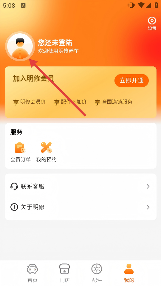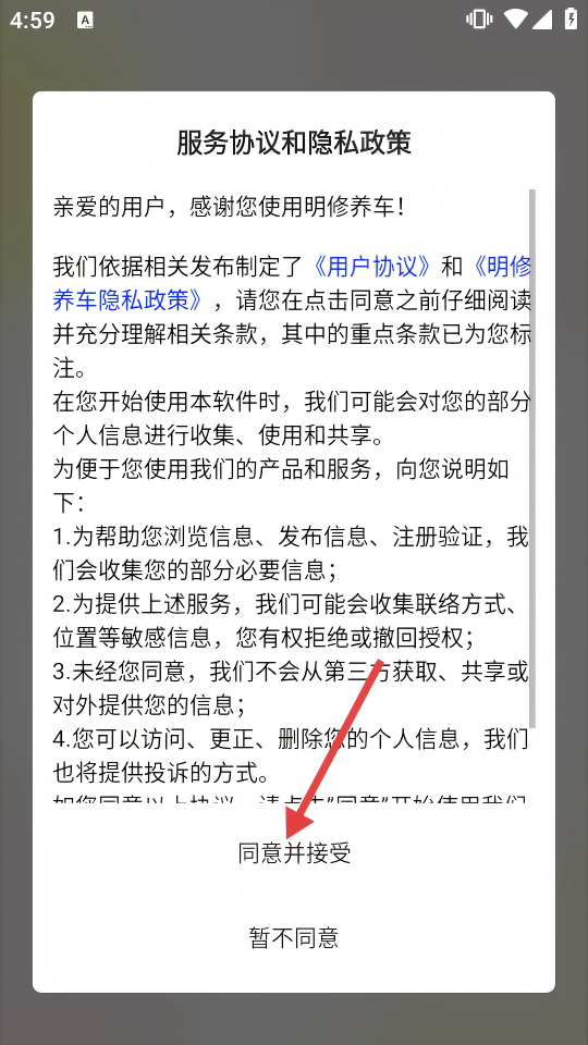 1、首次使用【明修养车】,请仔细阅读【服务协议】和【明修养车隐私政策】,点击【同意并接受】,进入APP主界面。