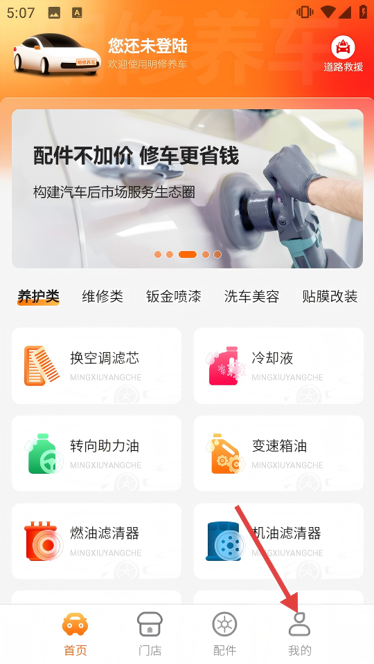 2、进入APP首页,可看到养护、维修等服务分类,点击底部【我的】,进入个人中心页面。
