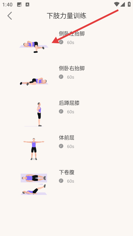 3、进入【下肢力量训练】后,选择具体健身动作进行查看。