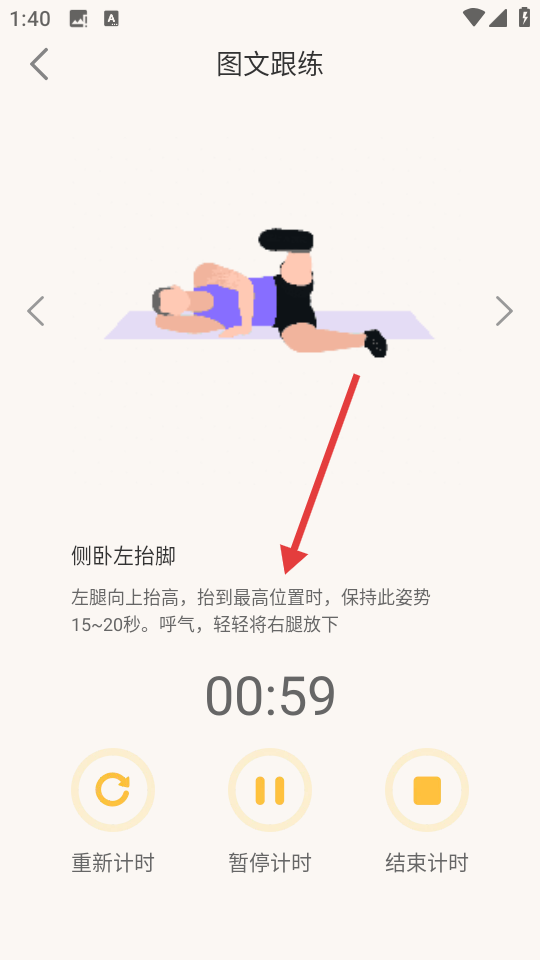 4、在图文跟练页面,可按照【侧卧左抬脚】的动作指导,结合计时功能进行训练。