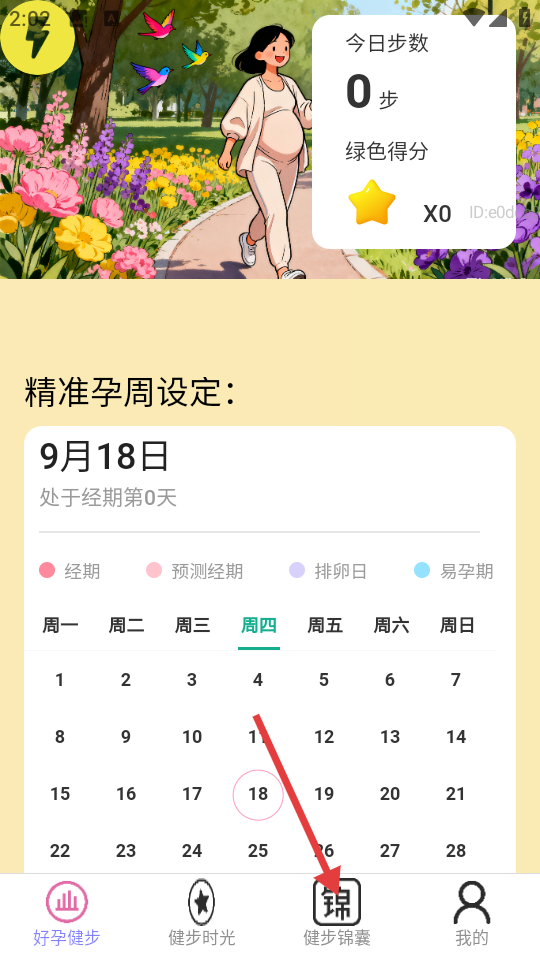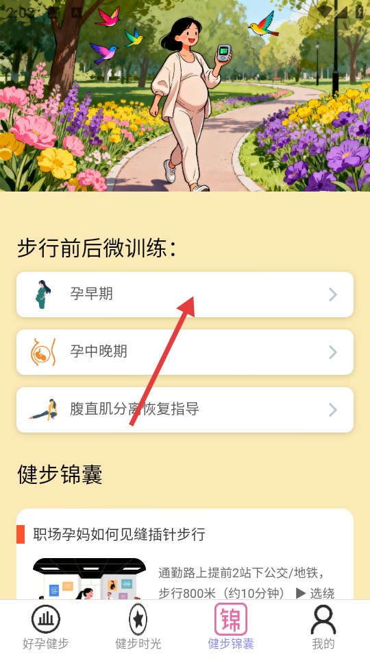 3、进入【健步锦囊】页面,可选择查看【孕早期】知识。