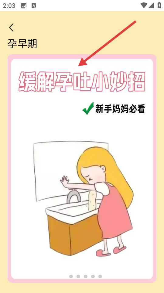 4、进入【孕早期】页面,可查看【缓解孕吐小妙招】,获取新手妈妈必看的孕吐缓解方法。