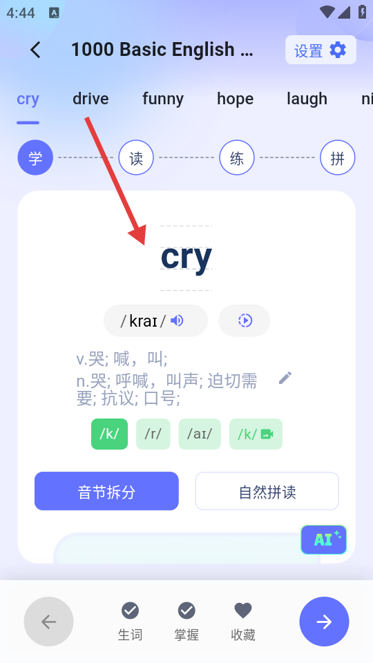 4、进入学习界面,即可进行单词学习,界面会展示单词如【cry】的音标、释义等内容。