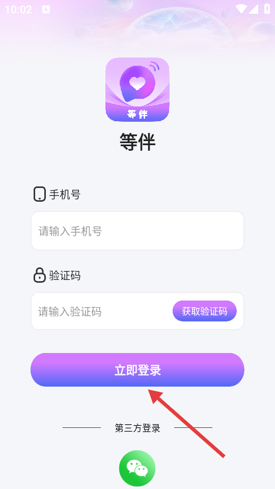 1、在登录界面,输入手机号,获取并输入验证码,点击【立即登录】,或选择第三方登录(如微信)。