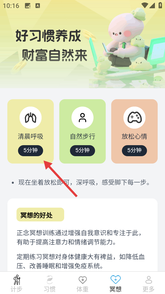 3、在冥想页面,可选择如【清晨呼吸-5分钟】的冥想项目。
