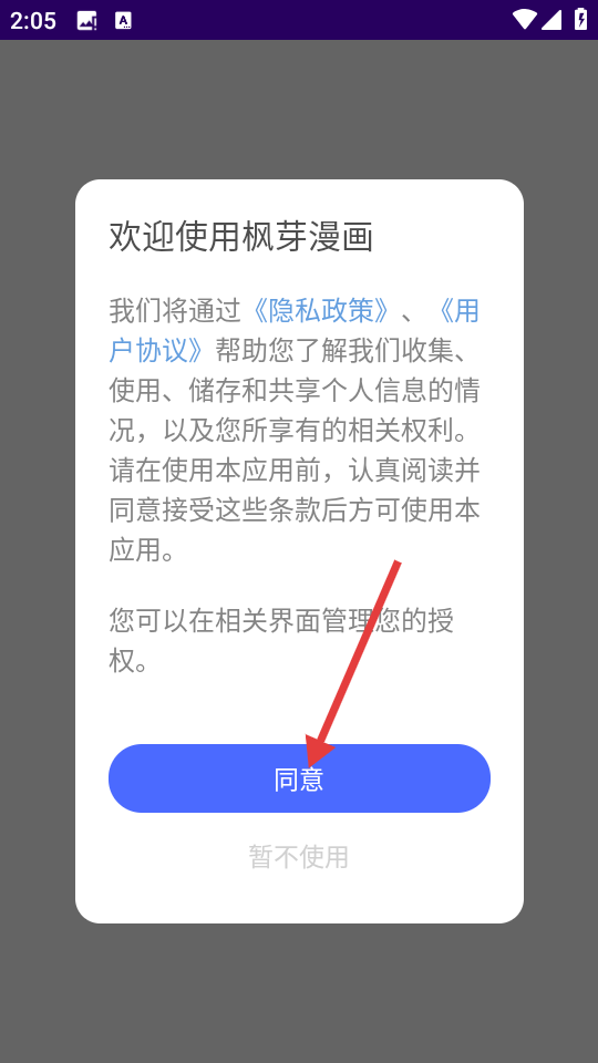 1、在欢迎弹窗中,点击【同意】,可使用该应用。