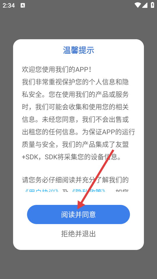 1、在温馨提示弹窗中,点击【阅读并同意】,使用该应用。