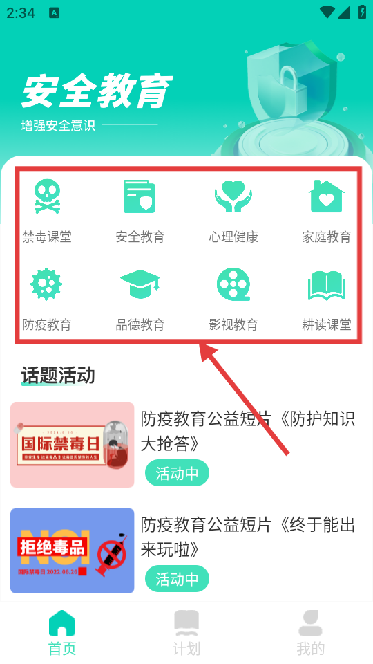 2、进入应用后,在安全教育板块选择想要的分类。