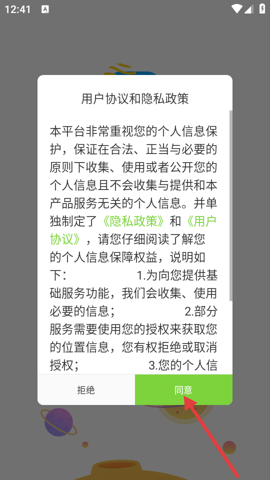 1、打开应用,阅读用户协议和隐私政策后点击【同意】。
