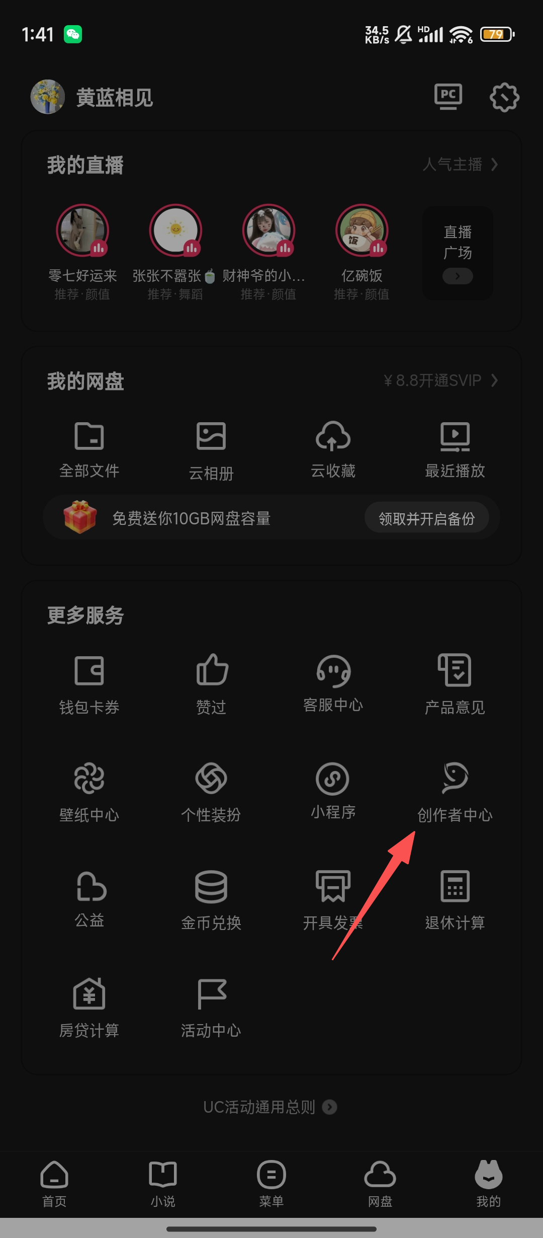 2、在【我的】页面中,找到并点击【创作者中心】选项,进入创作相关功能区。