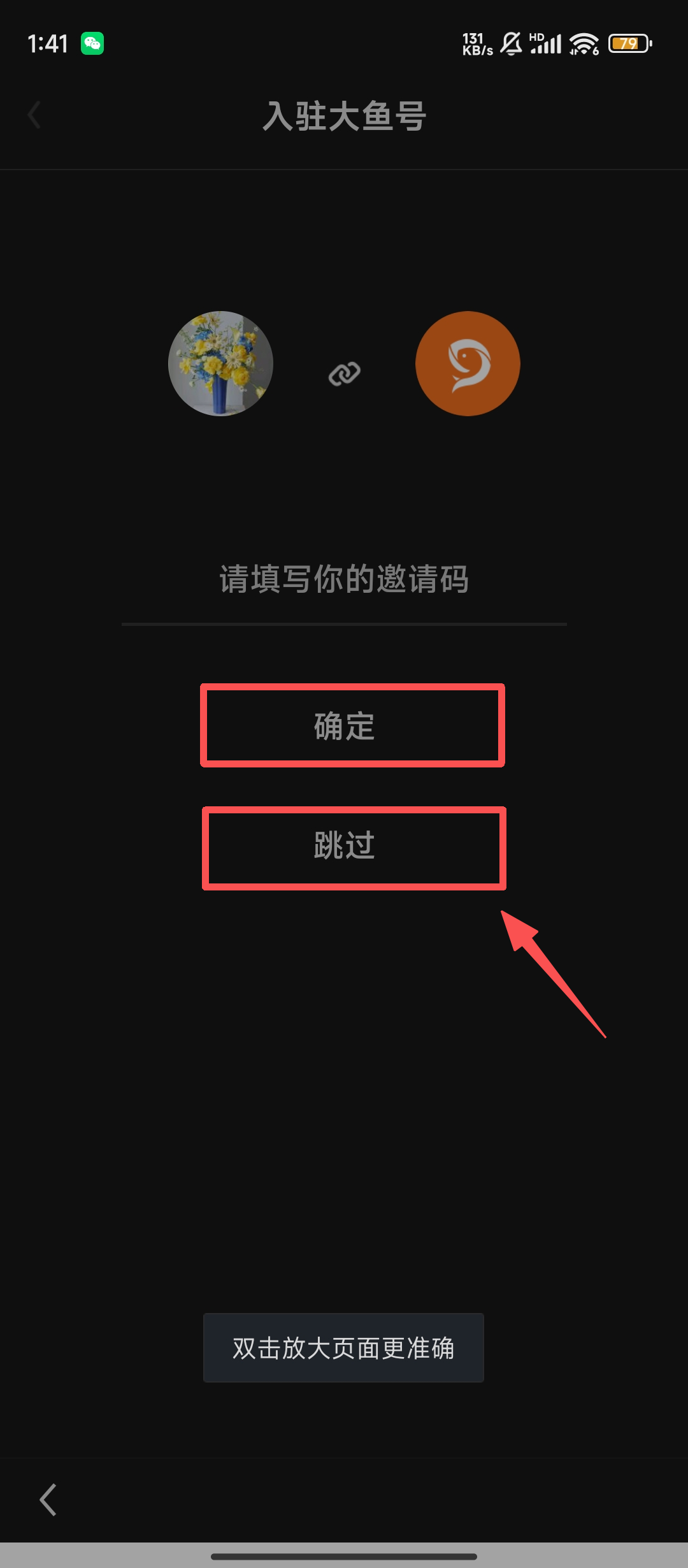 3、进入【入驻大鱼号】页面后,若没有邀请码,可直接点击【跳过】按钮,继续入驻流程。
