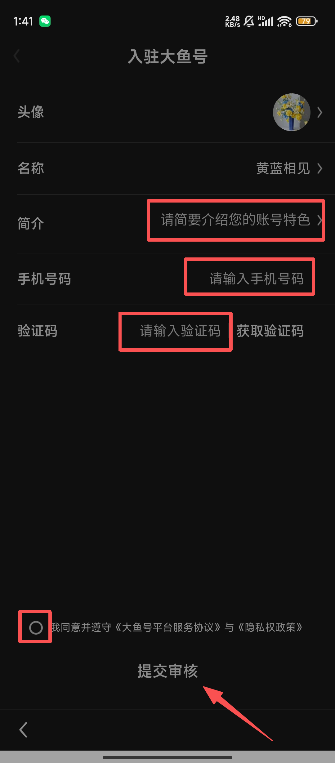 4、在信息填写页,依次完善【简介】、【手机号码】等,勾选协议后点击【提交审核】,等待审核通过即可。
