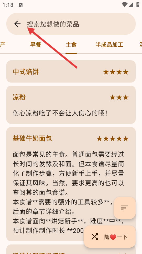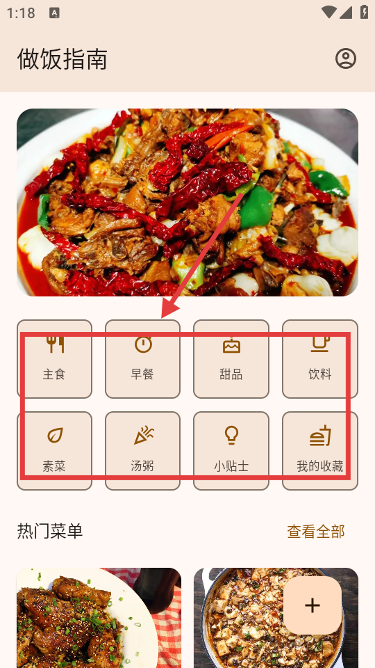 1、进入“做饭指南”界面,可根据需求点击【主食】【早餐】等分类按钮,查看对应品类菜品。