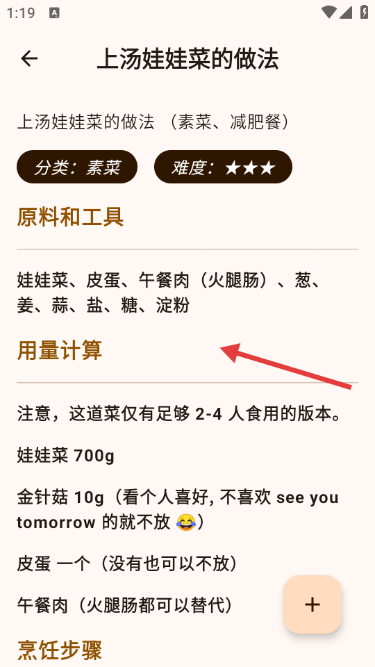 4、进入菜品详情页后,即可查看【上汤娃娃菜】的原料、工具、用量计算及烹饪步骤等内容。