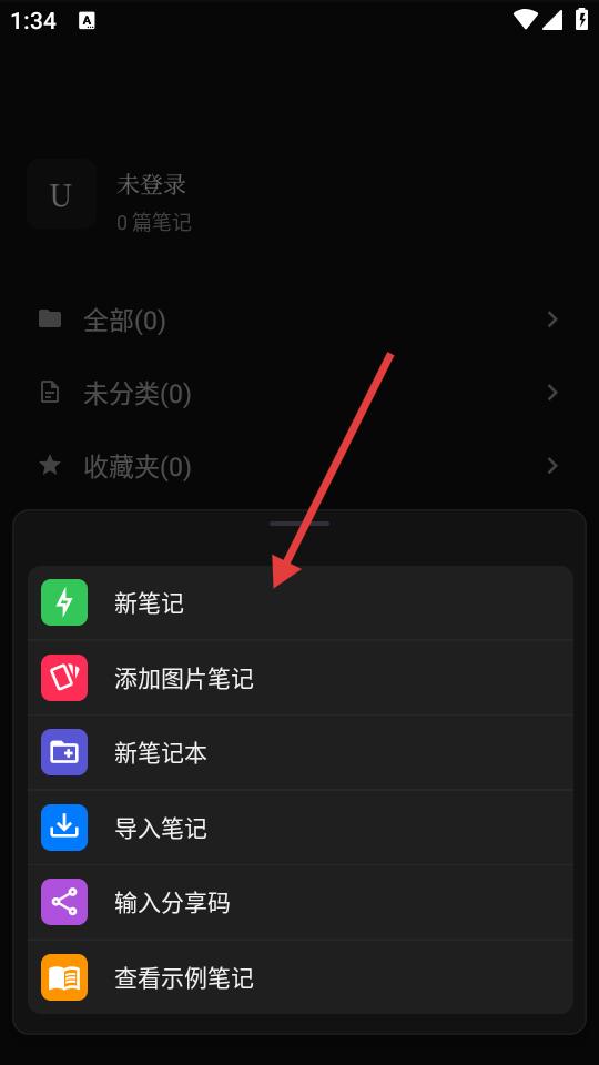 3、在功能选项中,点击【新笔记】,开启笔记创建流程。