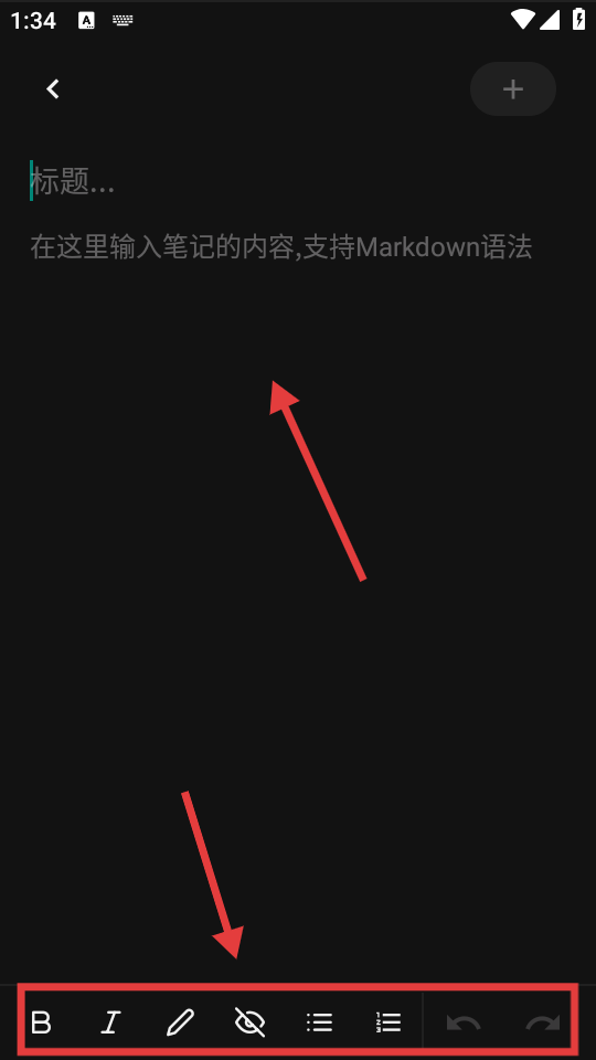 4、输入笔记标题,在内容区域输入内容,可利用下方工具按钮编辑。