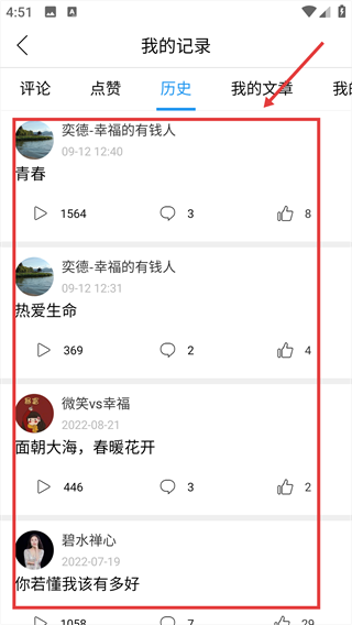 3、进入【我的记录】页面,可查看过往浏览过的作品列表。