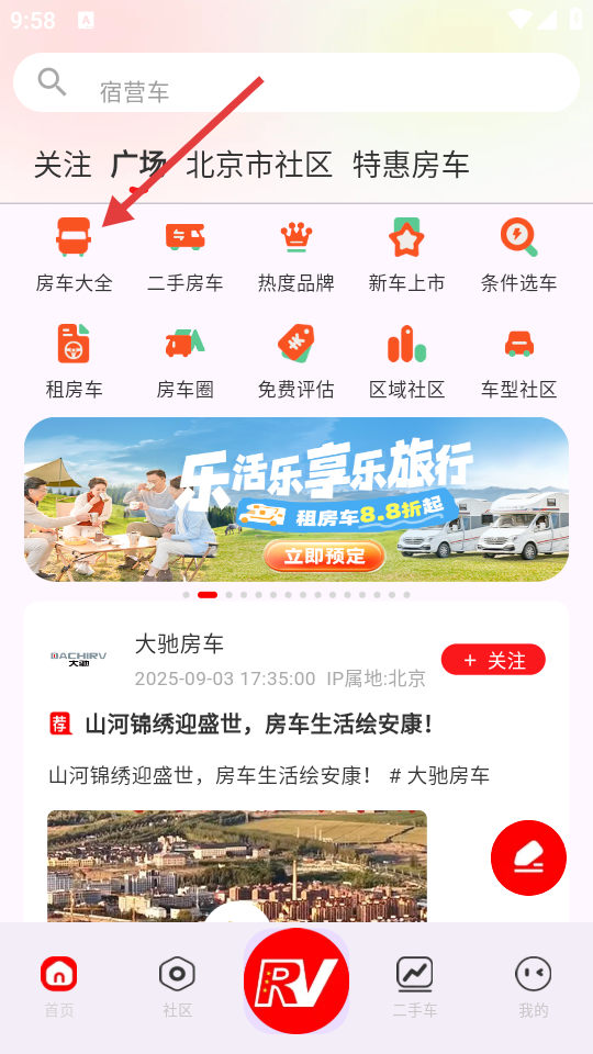 1、打开APP,进入首页后,点击【房车大全】选项,进入房车展示页面。