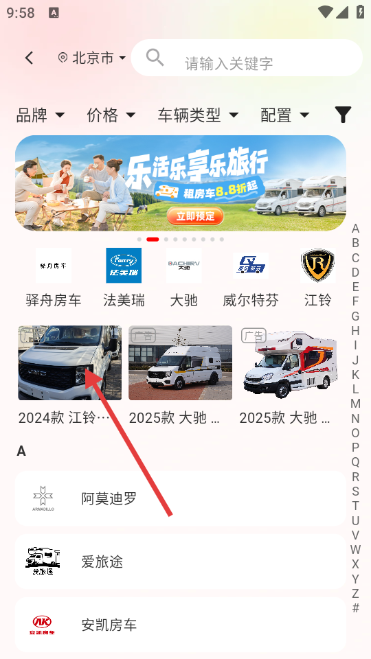 2、在房车展示页面,找到想要了解的房车,点击进入车辆详情页。