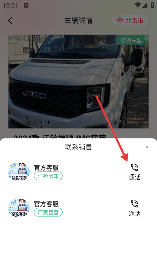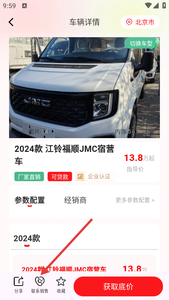 3、在车辆详情页,点击【联系销售】按钮,弹出联系销售选项。