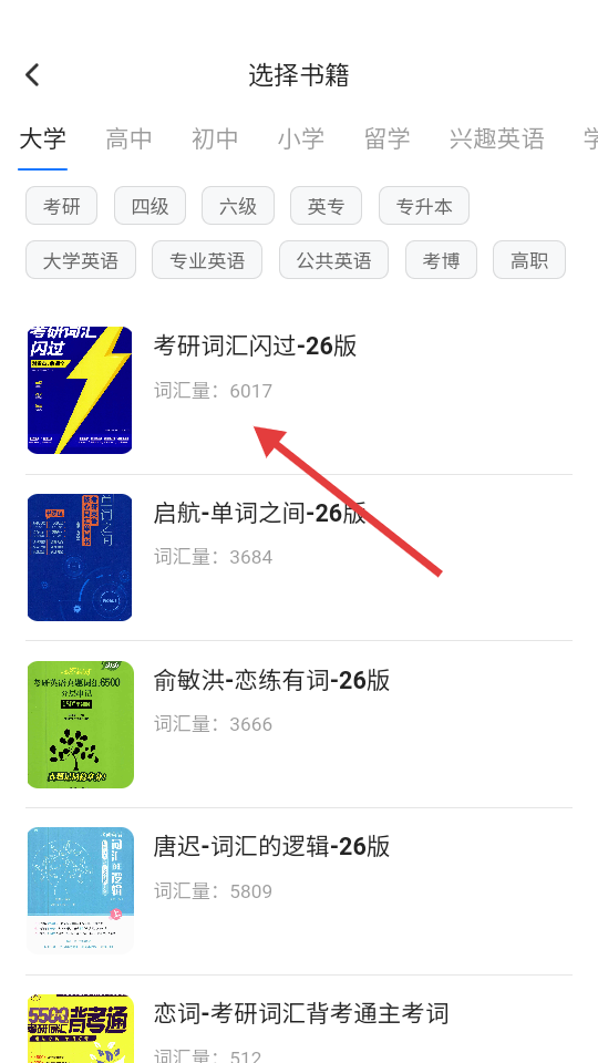 1、打开APP,进入“选择书籍”页面,选择想要学习的单词书,如“考研词汇闪过-26版”。