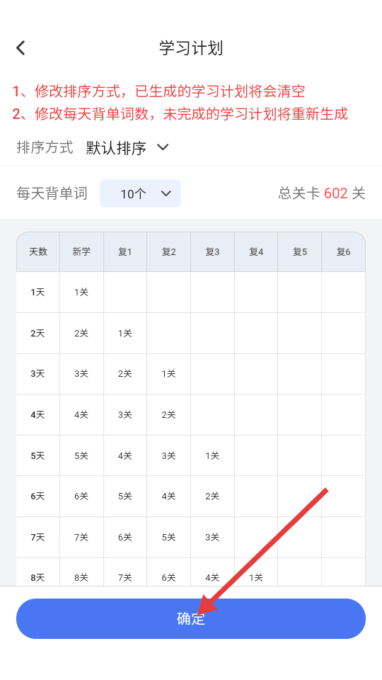 2、进入“学习计划”页面,设置每天背单词数量,点击【确定】按钮,生成学习计划。