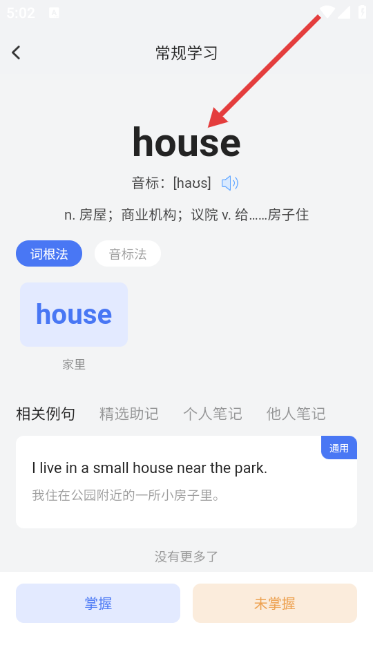 4、在“常规学习”页面,可查看单词的音标、释义等内容,学习完成后,可选择“掌握”或“未掌握”来标记学习情况。