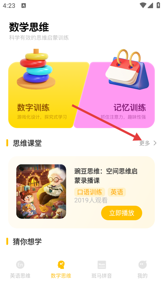 2、在“数学思维”页面,点击“思维课堂”右侧的【更多】按钮,进入“思维课堂”页面。