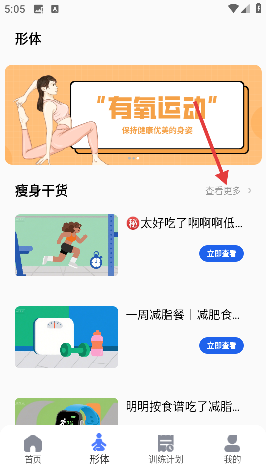 2、在“形体”页面,点击“瘦身干货”右侧的【查看更多】按钮,进入“瘦身干货”页面。