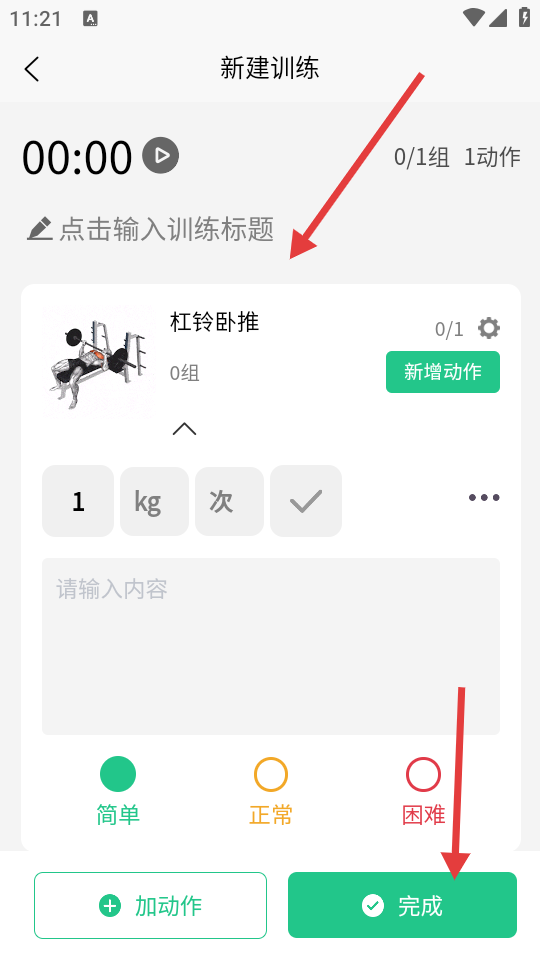 4、回到新建训练页面,可点击输入训练标题,设置动作的重量、次数等信息,最后点击【完成】按钮,完成训练计划的新建。
