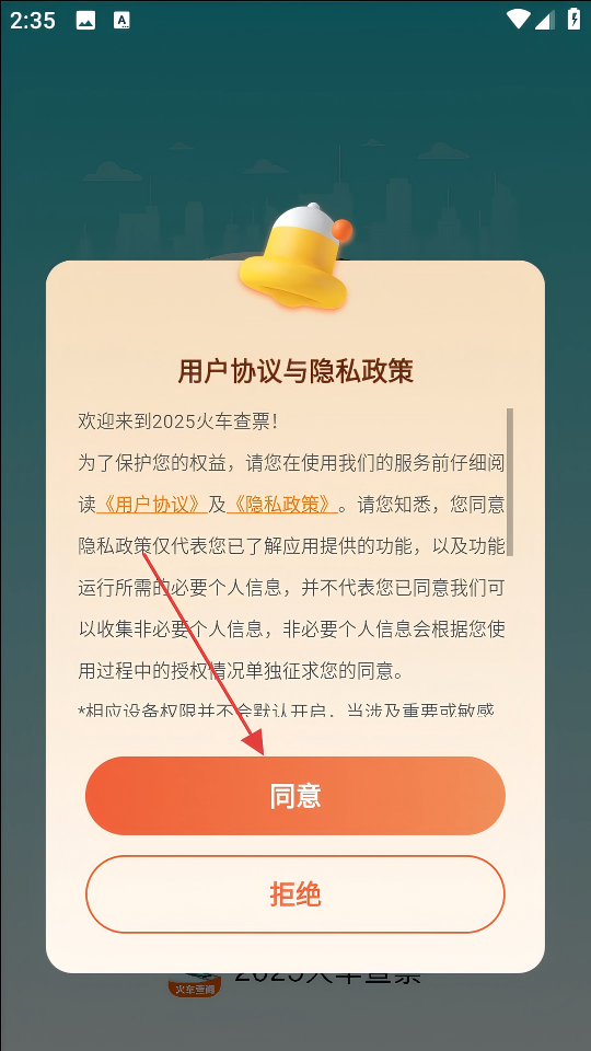 1、打开“火车查票”APP,在“用户协议与隐私政策”弹窗中点击【同意】。