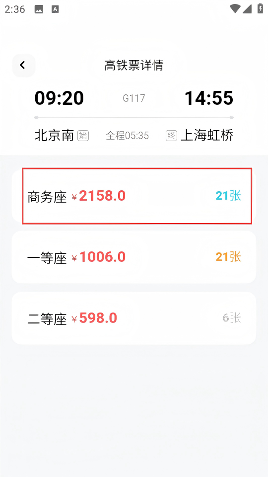4、点击车次,进入高铁票详情页面,查看商务座、一等座、二等座的价格和余票数量。