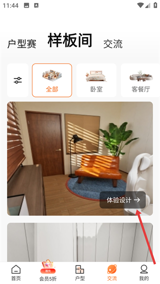 1、打开知户型,在【样板间】找到心仪设计,点击【体验设计】,即可进入户型绘制界面。