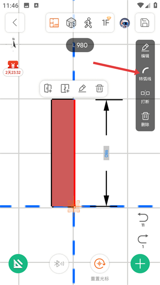 4、选中直墙后,点击右侧【转弧线】功能,就能将直墙变成弧形墙,轻松实现弧形墙绘制。