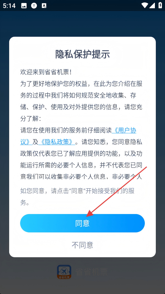 1、打开“省省机票”APP,在“隐私保护提示”弹窗中点击【同意】。